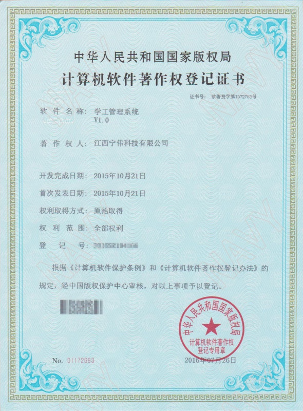 江西寧偉科技有限公司成功獲得《學(xué)工管理系統(tǒng)》軟件著作權(quán)證書