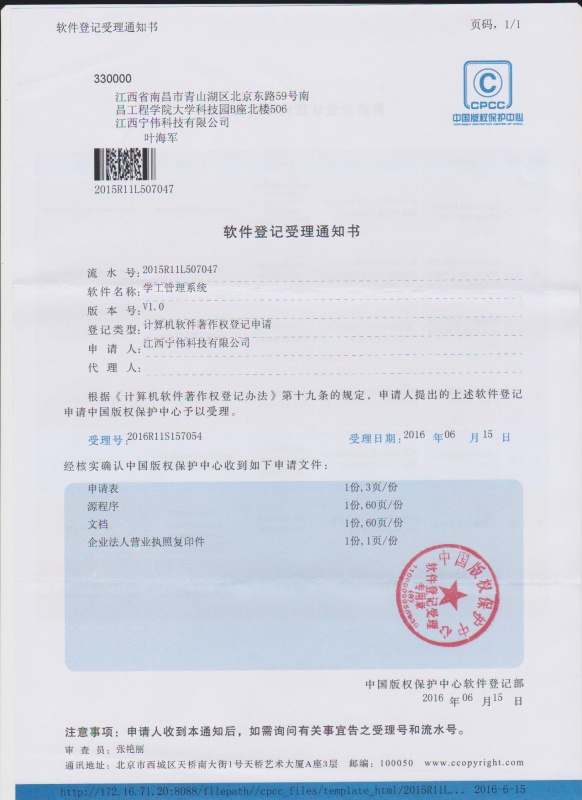 南昌市科技和信息局于2016年06月31日對我公司的《學(xué)工管理系統(tǒng)》軟件產(chǎn)品進(jìn)行審核,經(jīng)審核,申報材料和相關(guān)內(nèi)容符合《鼓勵軟件產(chǎn)業(yè)和集成電路產(chǎn)業(yè)發(fā)展的若干政策》和《軟件產(chǎn)品管理辦法》的有關(guān)規(guī)定,予以登記并頒發(fā)軟件產(chǎn)品登記證書。